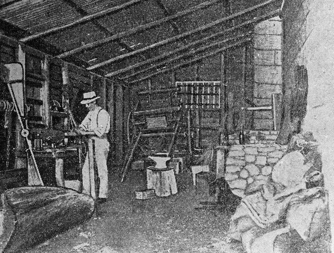 Press photograph of John R. Duigan in the workshop at Spring Plains where he fabricated parts for his biplane. Published in The Argus newspaper 28 January 1911. The original pine propeller made by John Fulton, a Carlton pattern-maker is seen on the left.