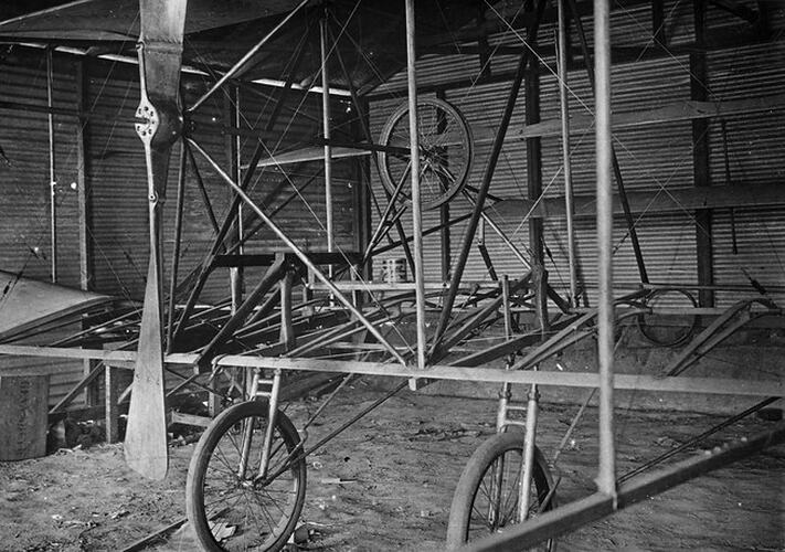 Duigan biplane under construction in its specially-built shed at Spring Plains, Mia Mia in early 1910. The wings are partially covered with fabric but the engine has yet to be fitted. Shows the propeller drive shaft assembly using a rubber V-belt later replaced with a chain drive.