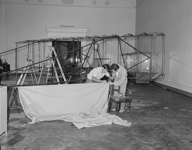 Photographic negative showing restoration work on the Duigan Biplane at the Science Museum of Victoria on Feb 24, 1970. Designed and constructed by J. R. Duigan in 1910, the biplane was the first aircraft to be manufactured and flown in Australia. It was displayed at Queen's Hall in the Swanston Street building until 1970, when it was moved to McArthur Hall.