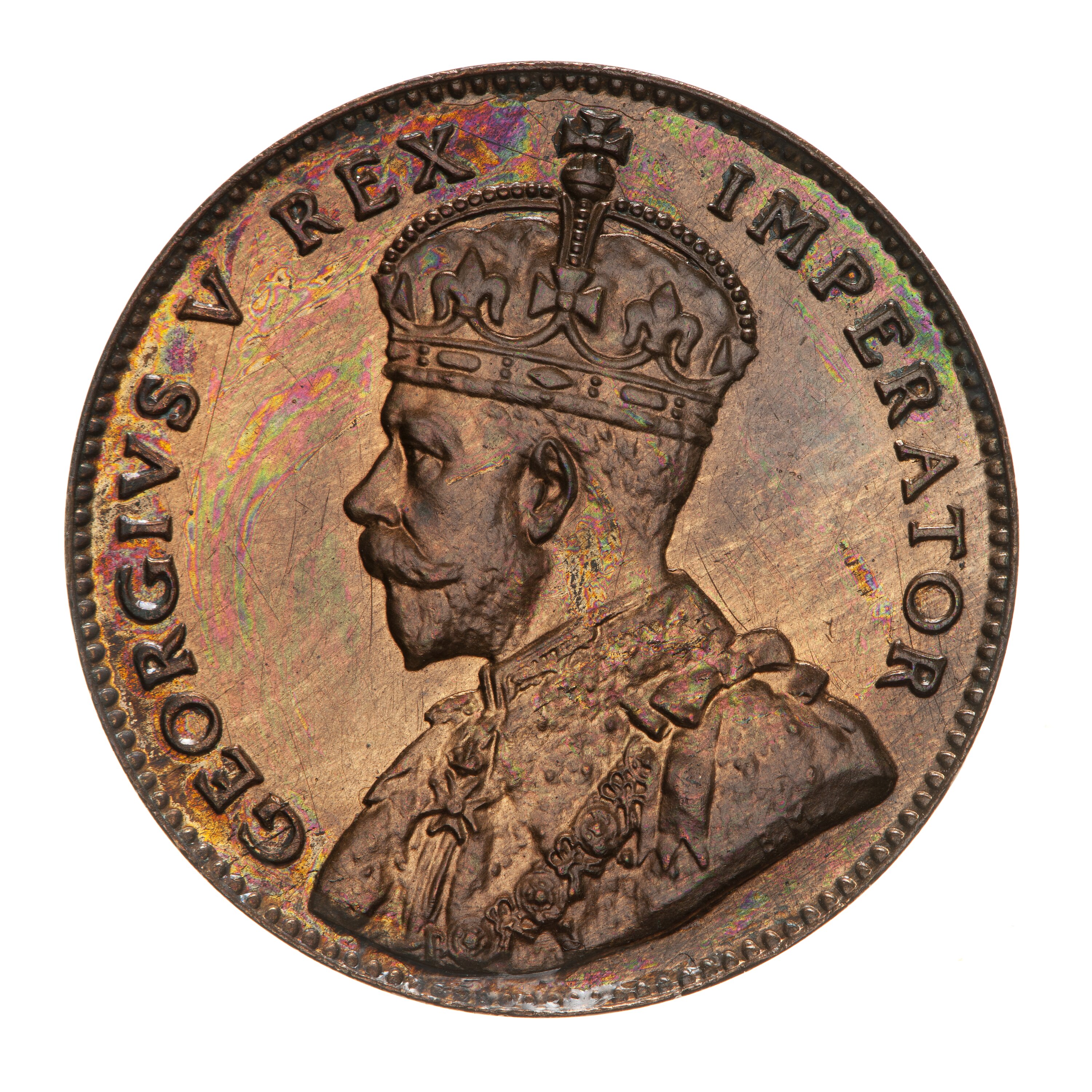 Crowned and draped bust of the King facing left, the King is wearing the Imperial Crown and the ermine Robe of State, the Collar of the Most Noble Order of the Garter, and the Badge of the Most Honourable Order of the Bath; around, GEORGE V REX IMPERATOR; on bust truncation, the artist's initials, BM