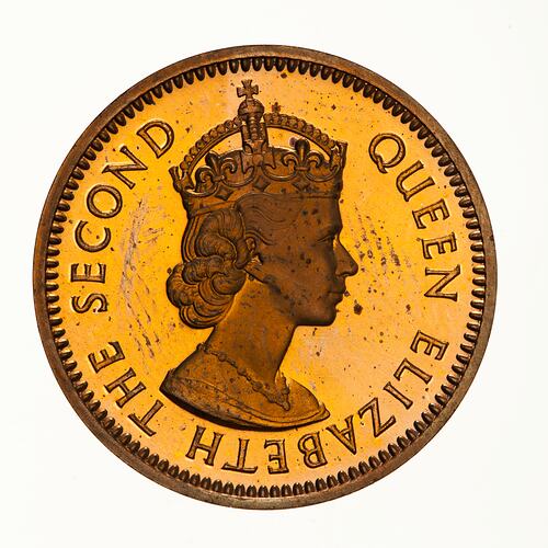Crowned bust of Elizabeth II right; around, QUEEN ELIZABETH THE SECOND, the artist's initials, CT, incuse on neck truncation
