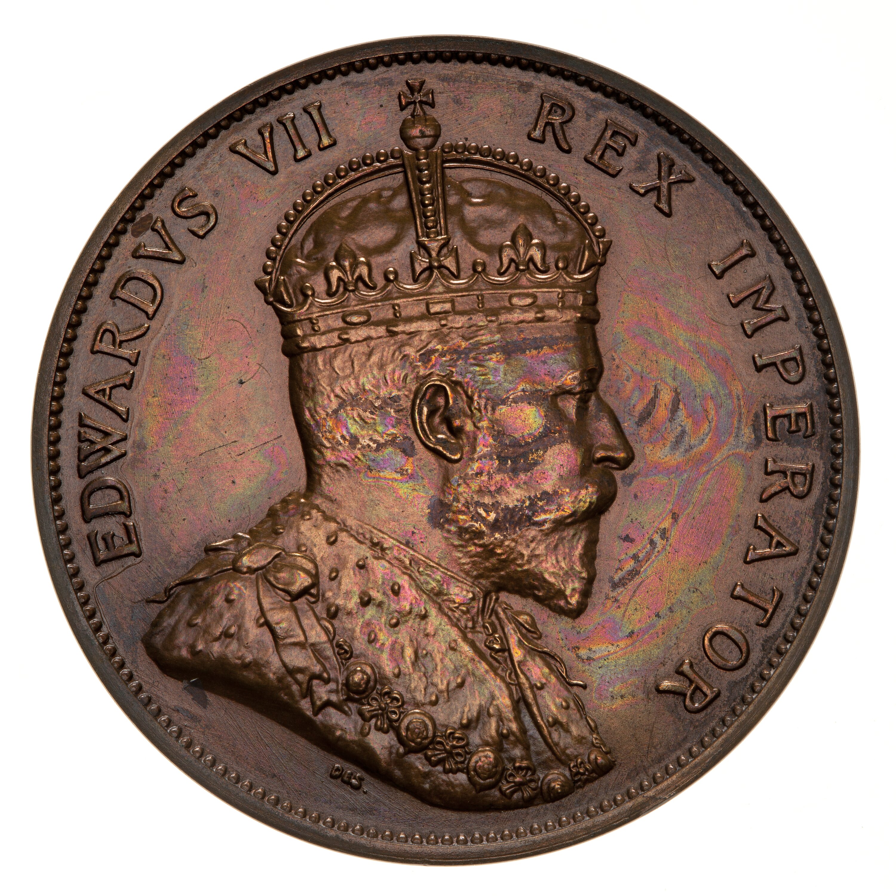Crowned and draped bust of the King facing right, the King is wearing the Imperial Crown and the ermine Robe of State, the Collar of the Most Honourable Order of the Bath; around, EDWARDVS VII REX IMPERATOR; below the bust truncation, the artist's initials, DES