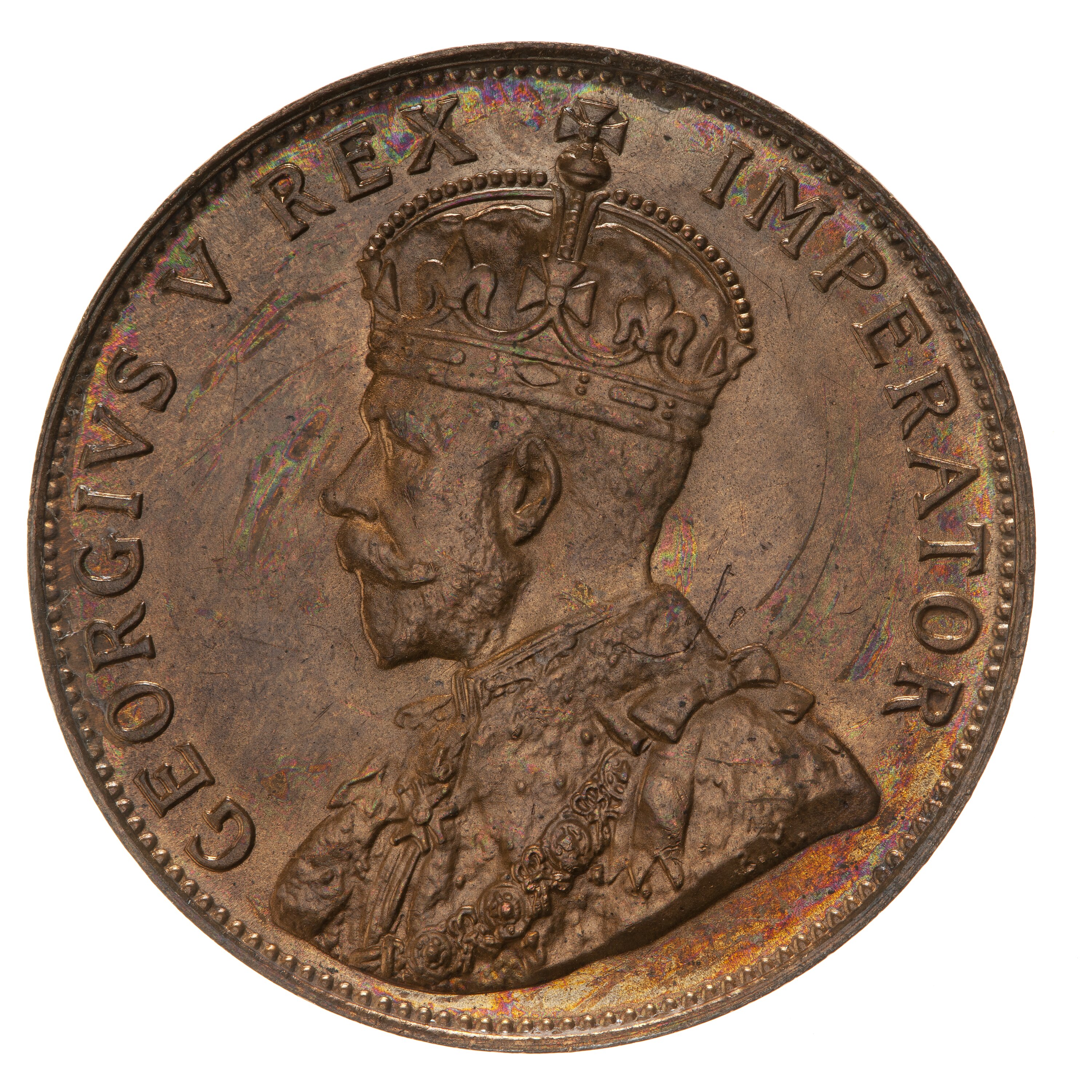 Crowned and draped bust of the King facing left, the King is wearing the Imperial Crown and the ermine Robe of State, the Collar of the Most Noble Order of the Garter, and the Badge of the Most Honourable Order of the Bath; around, GEORGE V REX IMPERATOR; on bust truncation, the artist's initials, BM