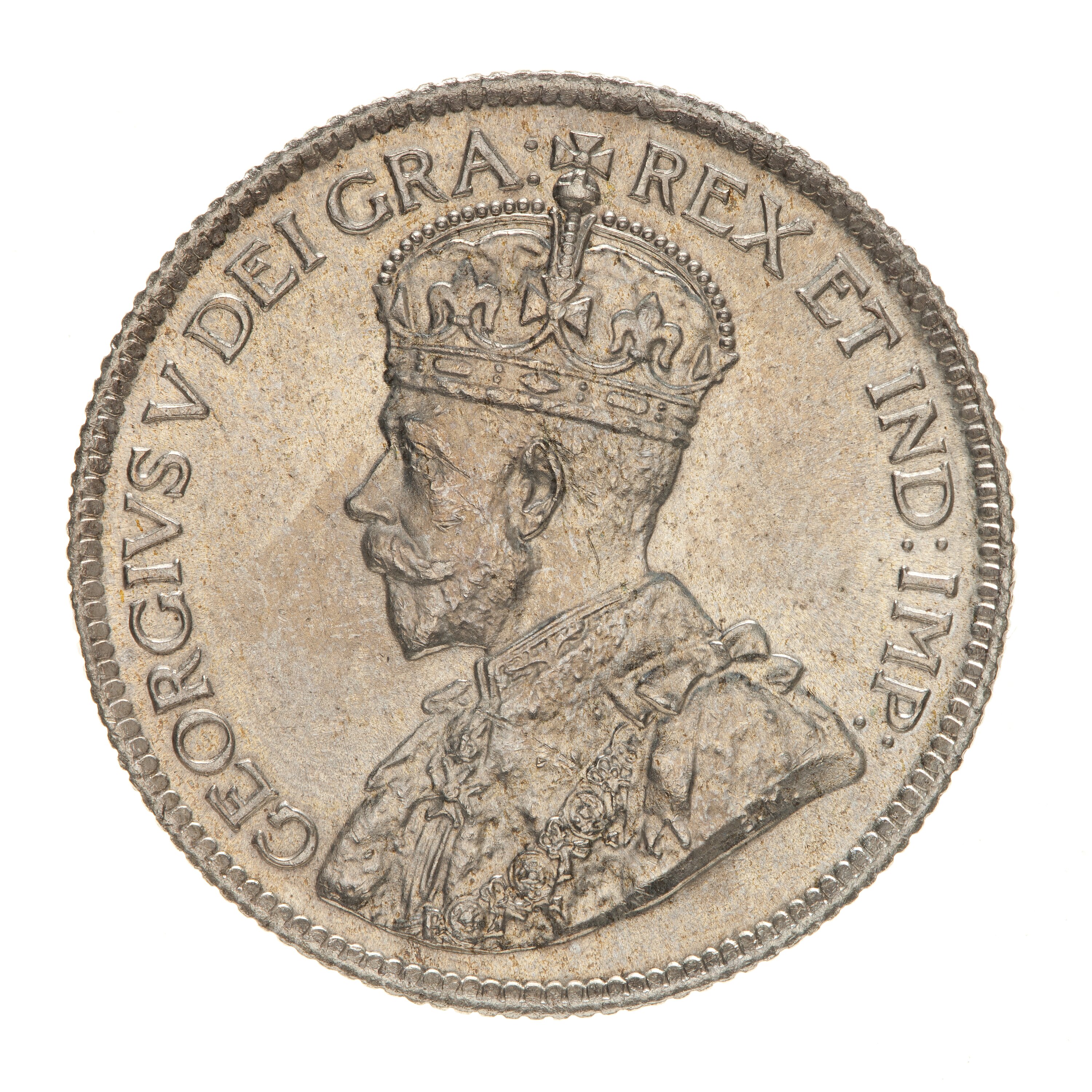 Crowned and draped bust of the King facing left, the King is wearing the Imperial Crown and the ermine Robe of State, the Collar of the Most Noble Order of the Garter, and the Badge of the Most Honourable Order of the Bath; around, GEORGIVS V DEI GRA: REX ET IND: IMP:; on bust truncation, the artist's initials, BM