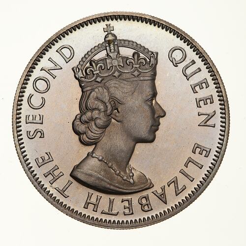 Crowned bust of Elizabeth II right; around, QUEEN ELIZABETH THE SECOND, the artist's initials, CT, incuse on neck truncation