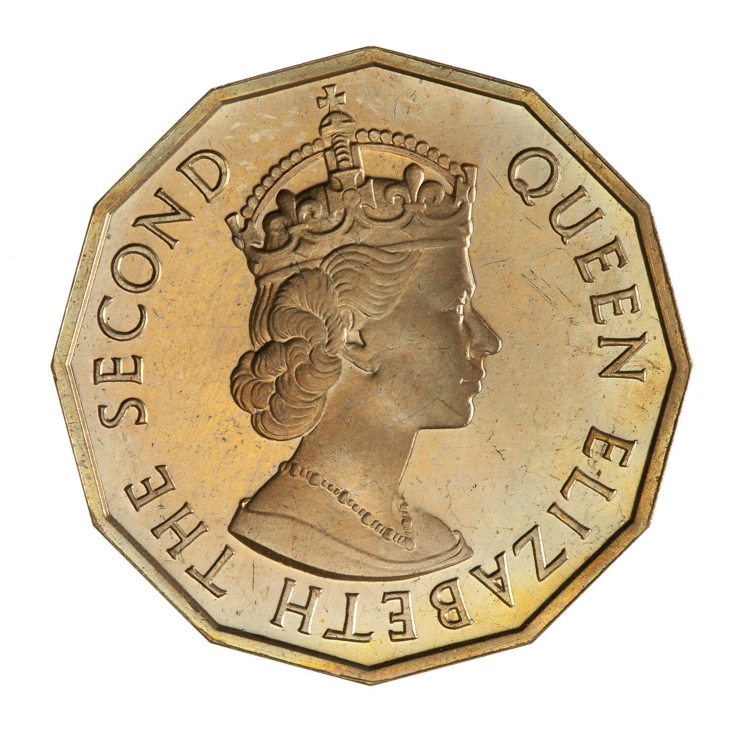 Crowned bust of the queen facing right; around, QUEEN ELIZABETH THE SECOND; artist's initials, CT, incuse on bust truncation