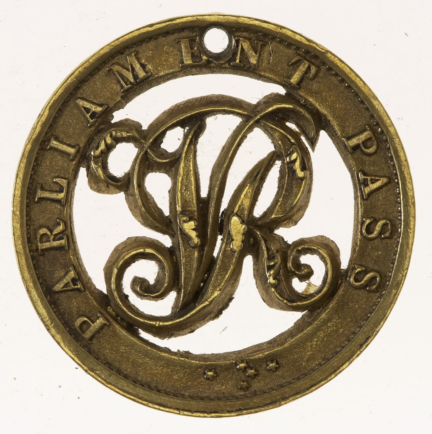 A circular shaped gold Parliament Pass of the Victorian Railways holed for wearing, the letters VR are voided at the centre