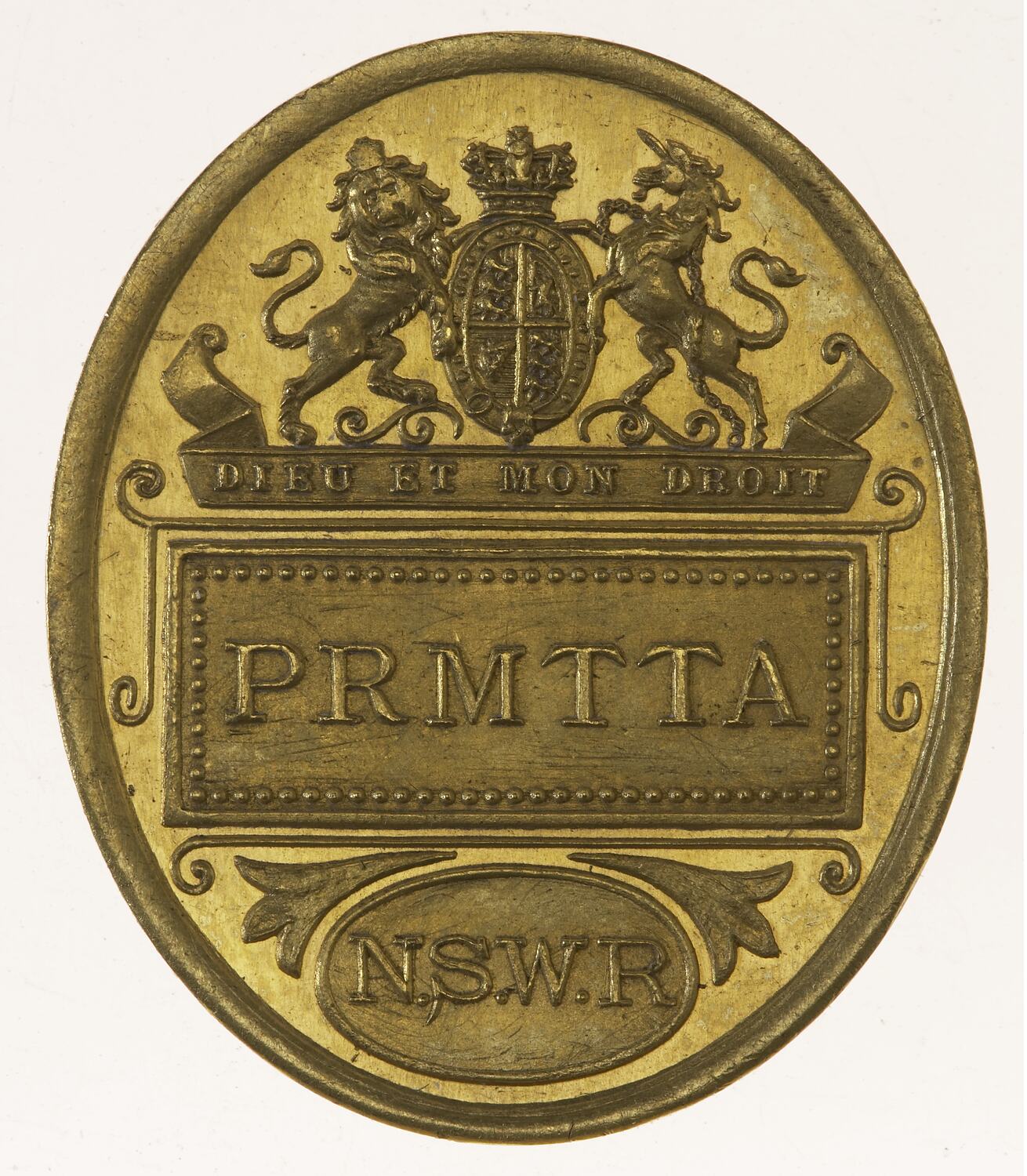 PRMTTA/N.S.W.R Royal Coat of Arms, underneath within banner DIEU ET MON DROIT