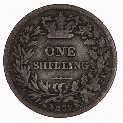 Within a wreath of laurel and oak, ONE SHILLING; above, crown; below wreath, 1837