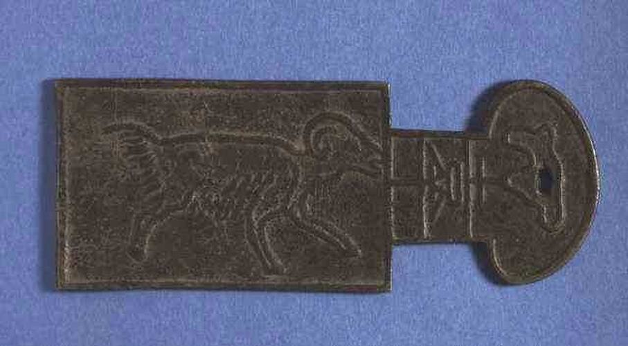 Chinese copper good luck charm with relief pattern of a goat on one side and dots on the other.