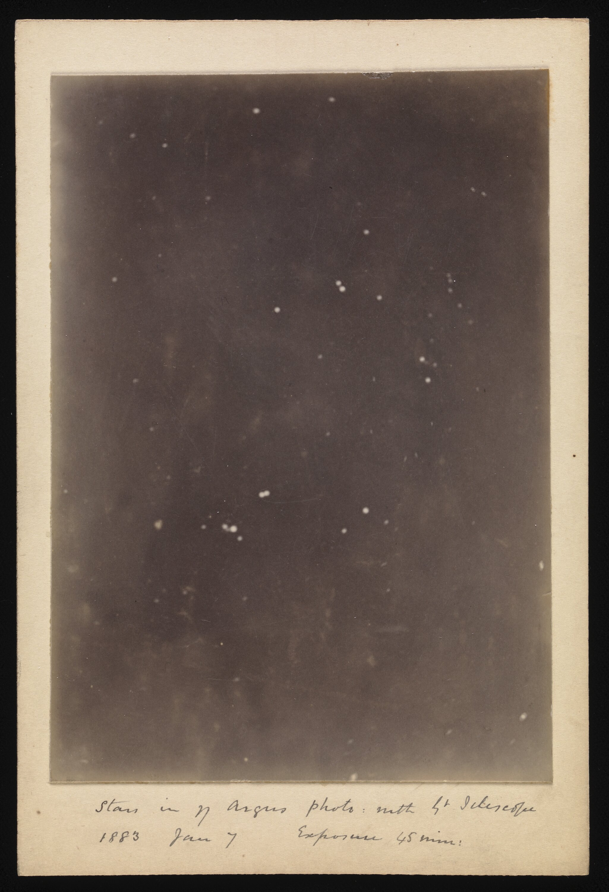 PRINT MOUNTED ON CARD MARKED STARS IN N ARGUS PHOTO WITH GT TELESCOPE 1883 JAN 7 EXPOSURE 45 MIN BOX 5.6 PHOTOGRAPHIC PRINTS