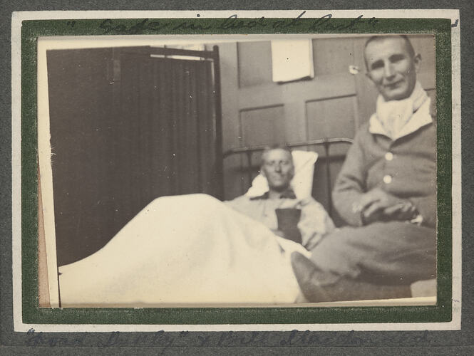 Photograph of two soldiers in an hospital ward. One of the soldiers (previously identified as Bill MacDonald) is lying in bed. While the other soldier (identified as "Lord Dudley") is sitting on his right hand side. Lord Dudley is wearing a special blue hospital uniform issued to wounded soldiers. This uniform is sometimes known as 'Hospital blues'.