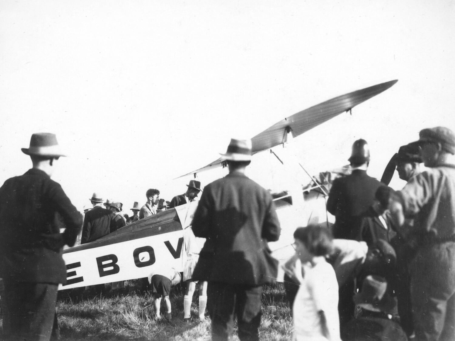 Crowd gathered around Hinkler 's Avro Avian aeroplane.