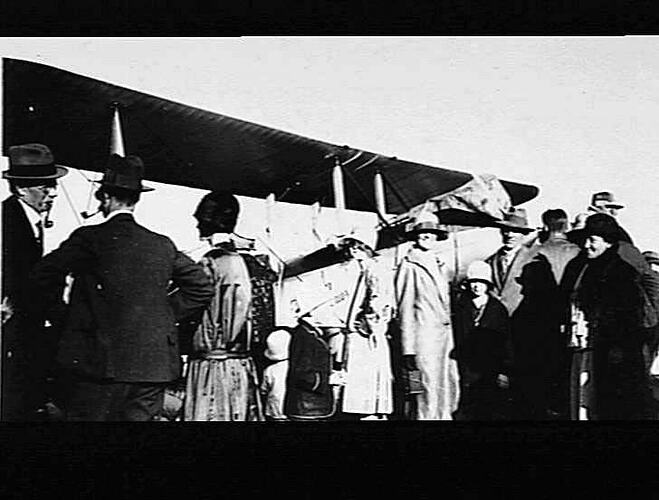 Crowd gathered around Hinkler 's Avro Avian aeroplane.