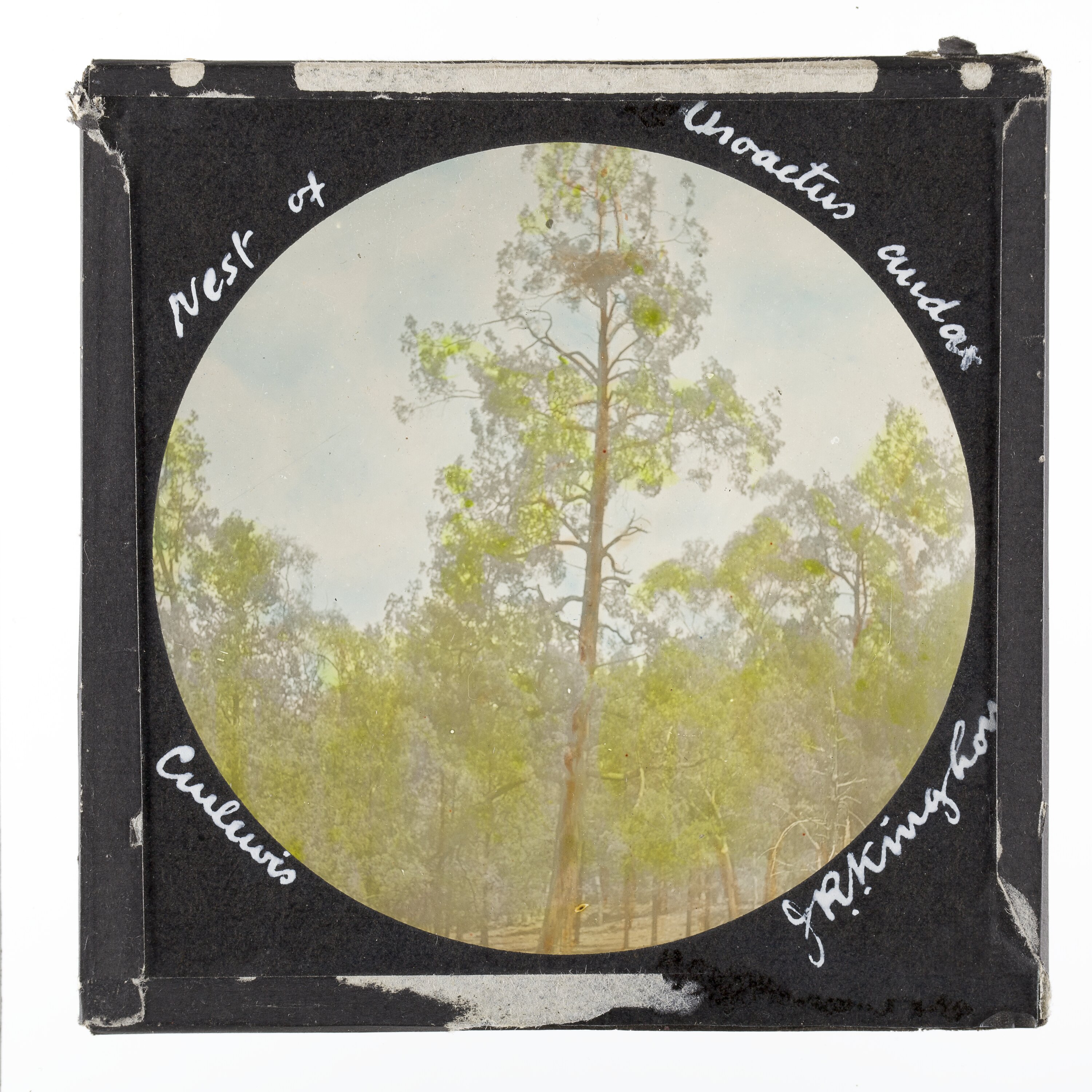Coloured lantern slide depicting the nest of a wedge-tailed eagle in a bush land setting.