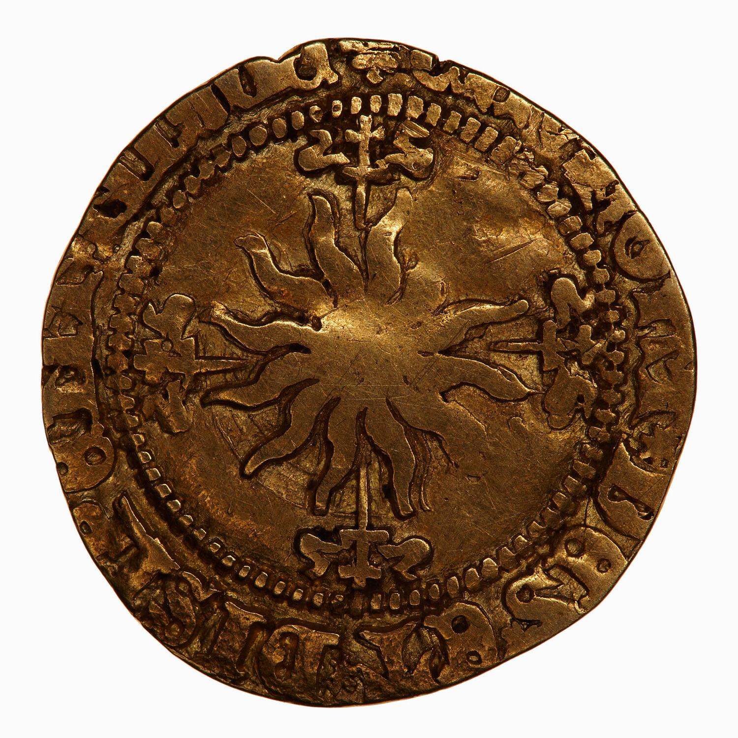 At centre witin a circle of beads, floriated cross on which a star of 12 waved rays; around, EXVRGAT DES ET DISIPENT NIMICI (translation, Let God arise and let his enemies be scattered) note: coin has been clipped, tops of many letters missing