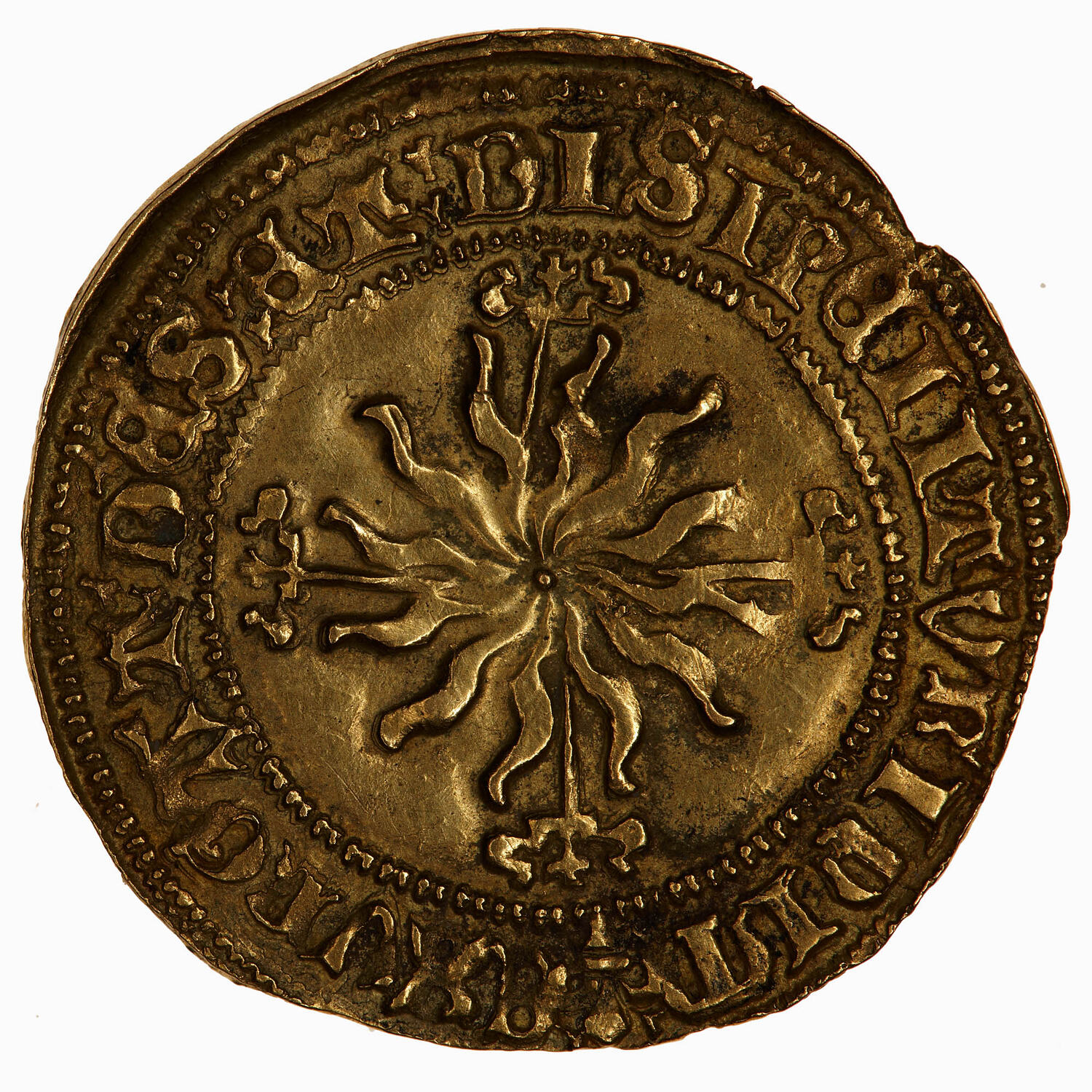 At centre witin a circle of beads, floriated cross on which a star of 12 waved rays; around, (mm. lis) EXVRGAT DES ET DISIPEIITVR INIM (translation, Let God arise and let his enemies be scattered) note: N of DISIPENTVR as II, N of INIM Lombardic