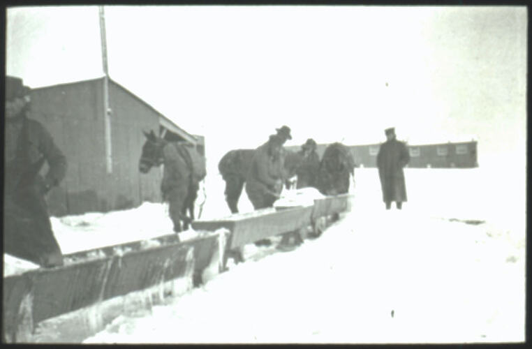 Lantern slide depicting Australian soldiers with their horses at frozen water troughs.