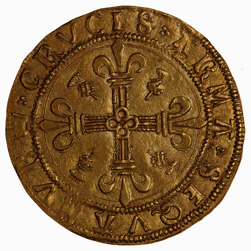 Within a beaded circle, cross fleury with quatrefoil at centre, thistle in each angle; around, (mm. crown) CRVCIS ARMA SEQVAMVR (translation, Let us follow the arms of the cross)