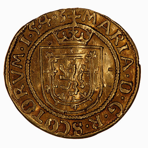 At centre within a beaded circle, crowned shield charged with the lion rampant; around, + MARIA D G SCOTORVM 1543