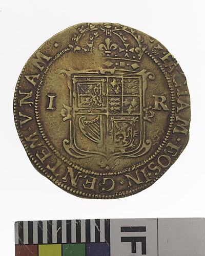 Crowned an garnished shield bearing the arms of Scotland (1 & 4), England (2) and Ireland (3), dividing the letters I R; around, (mm. thistle) FACIAM EOS IN GENTEM VNAM (translation, I will make them one nation)