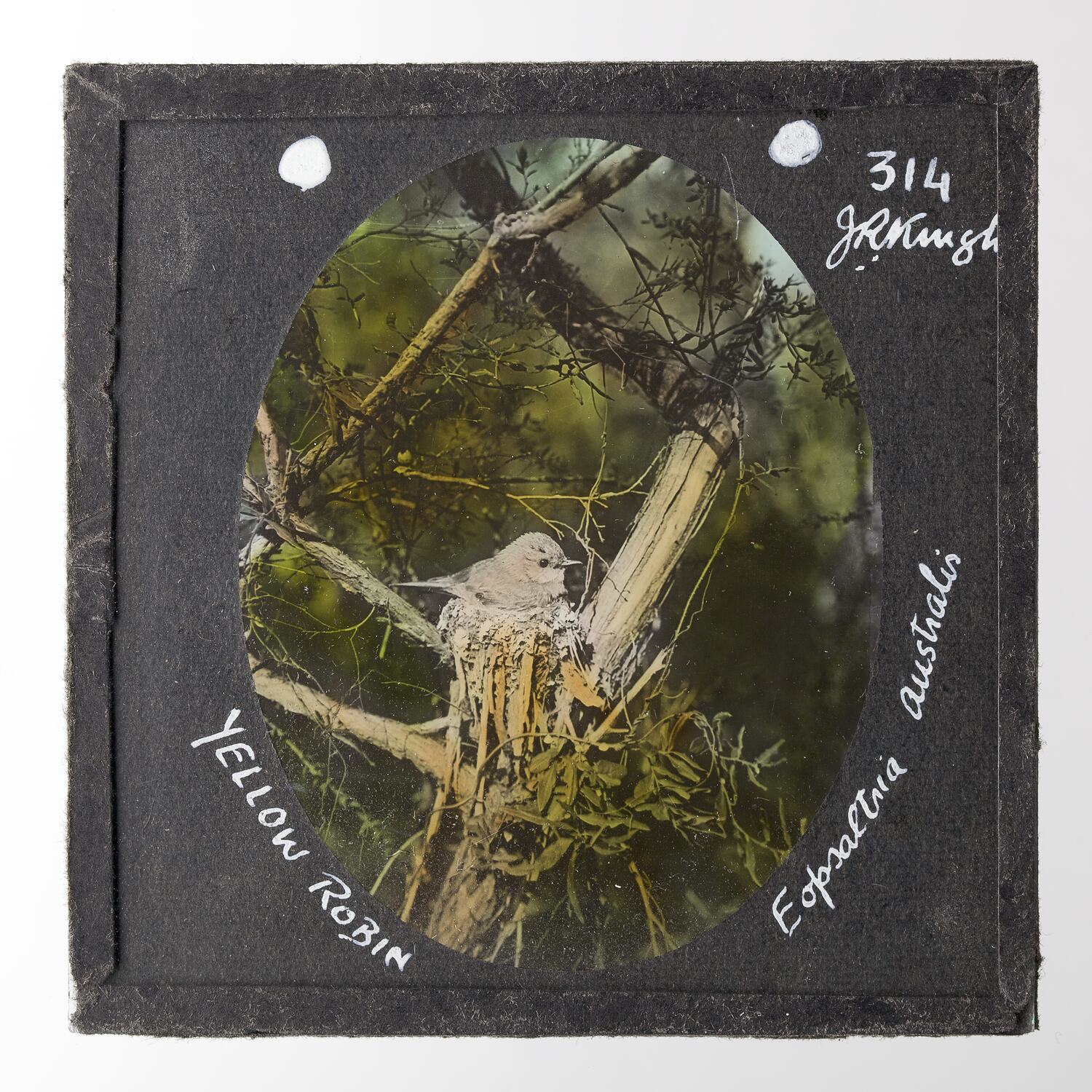 Hand written in white ink on dark grey paper frame in top right hand corner of slide: 314 / J.R.Kinghorn Hand written in white ink on dark grey paper frame in bottom right hand corner of slide: Eopsaltria australis Hand written in white ink on dark grey paper frame in bottom left hand corner of slide: YELLOW ROBIN