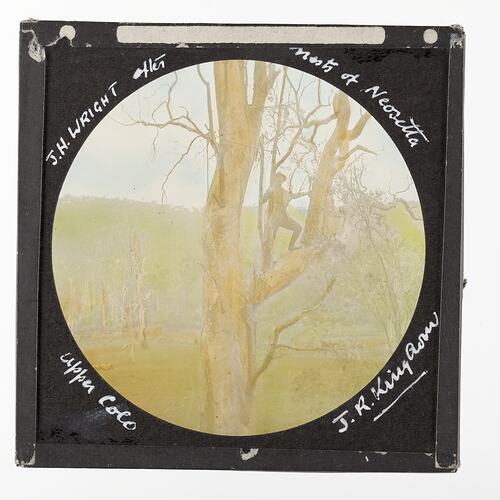 Hand written in white ink on dark grey paper frame in top left hand corner of slide: J. H. WRIGHT after Hand written in white ink on dark grey paper frame in top right hand corner of slide: nests of Neositta Hand written in white ink on dark grey paper frame in bottom left hand corner of slide: Upper Colo Hand written in white ink on dark grey paper frame in bottom right hand corner of slide: J. R. Kinghorn (underlined)