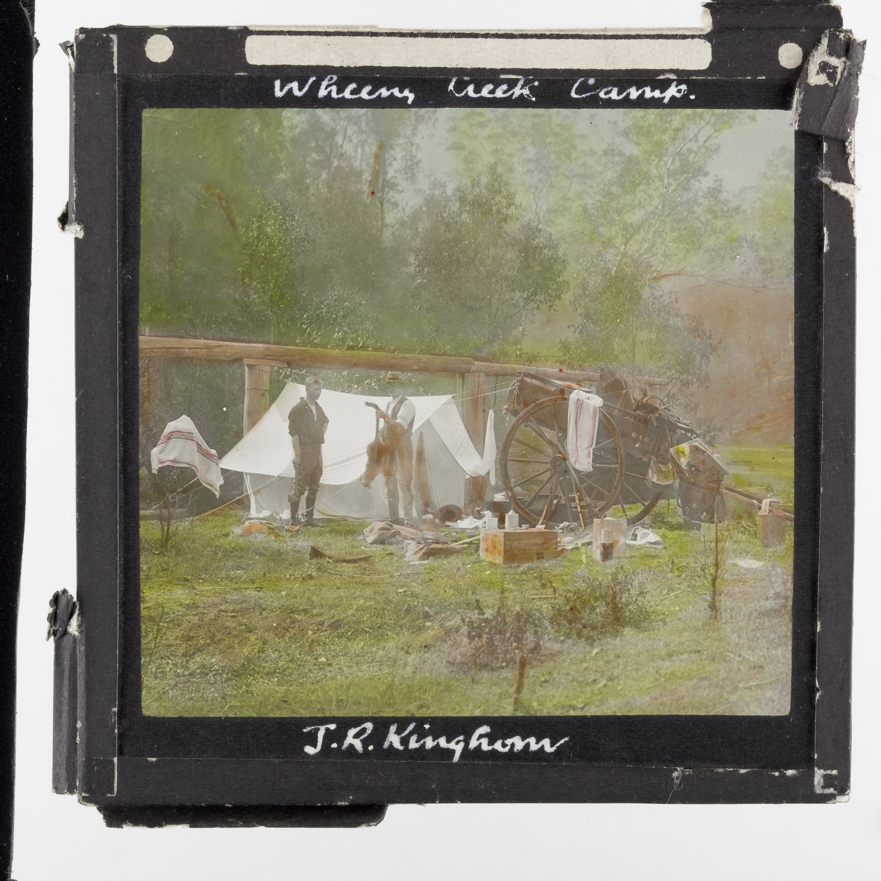 Coloured lantern slide depicting two men beside a tent and a carriage at the Weeny Creek Camp.