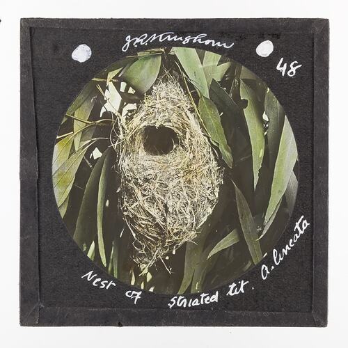 Hand written in white ink on top of black paper frame: J. R. Kinghorn / 48 Hand written in white ink on bottom of black paper frame: Nest of striated tit. a. lineata
