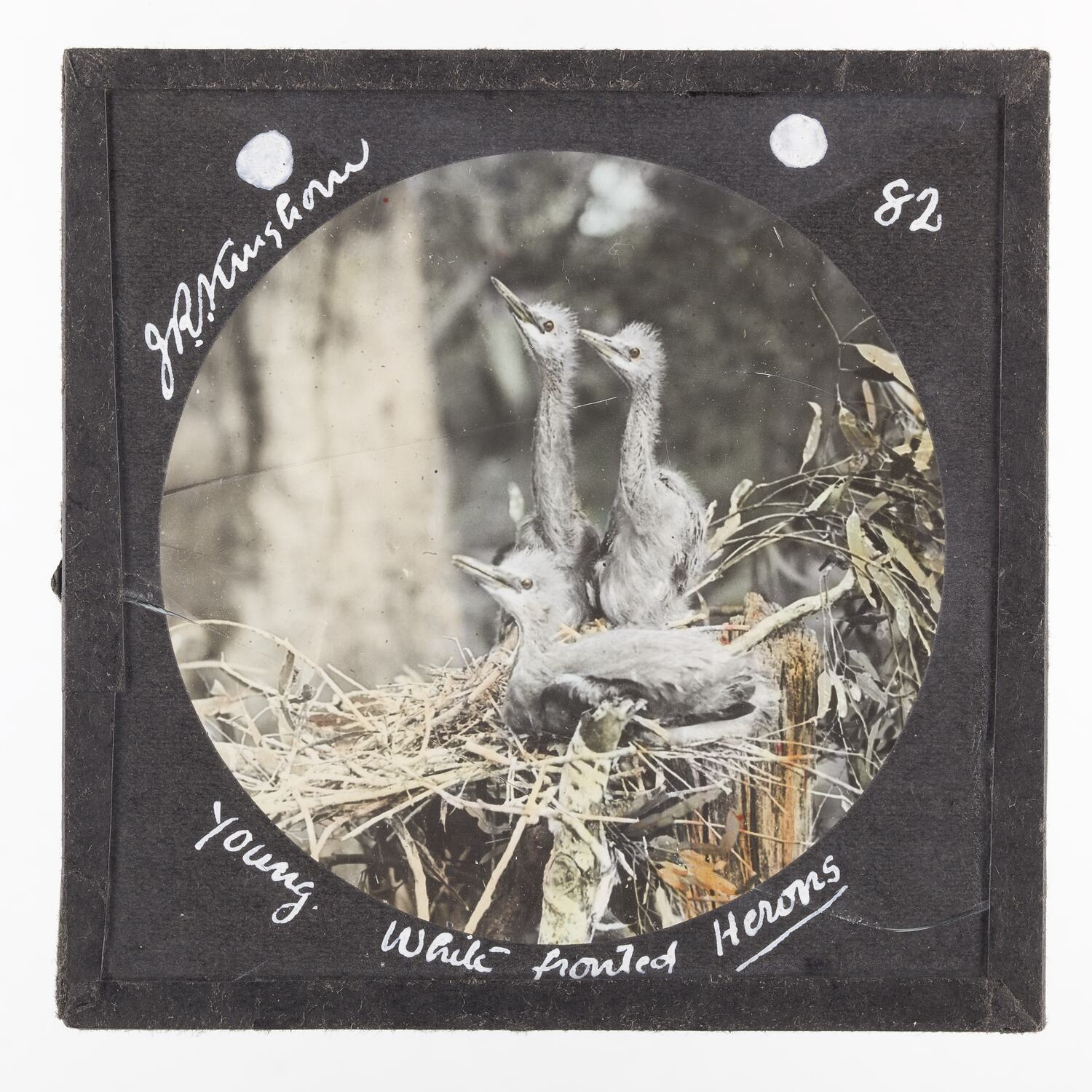 Hand written in white ink on dark grey paper frame on top left hand side of slide: J. R. Kinghorn Hand written in white ink on dark grey paper frame on top right hand side of slide: 82 Hand written in white ink on dark grey paper frame below image: Young. White fronted Herons (Herons underlined in white ink)