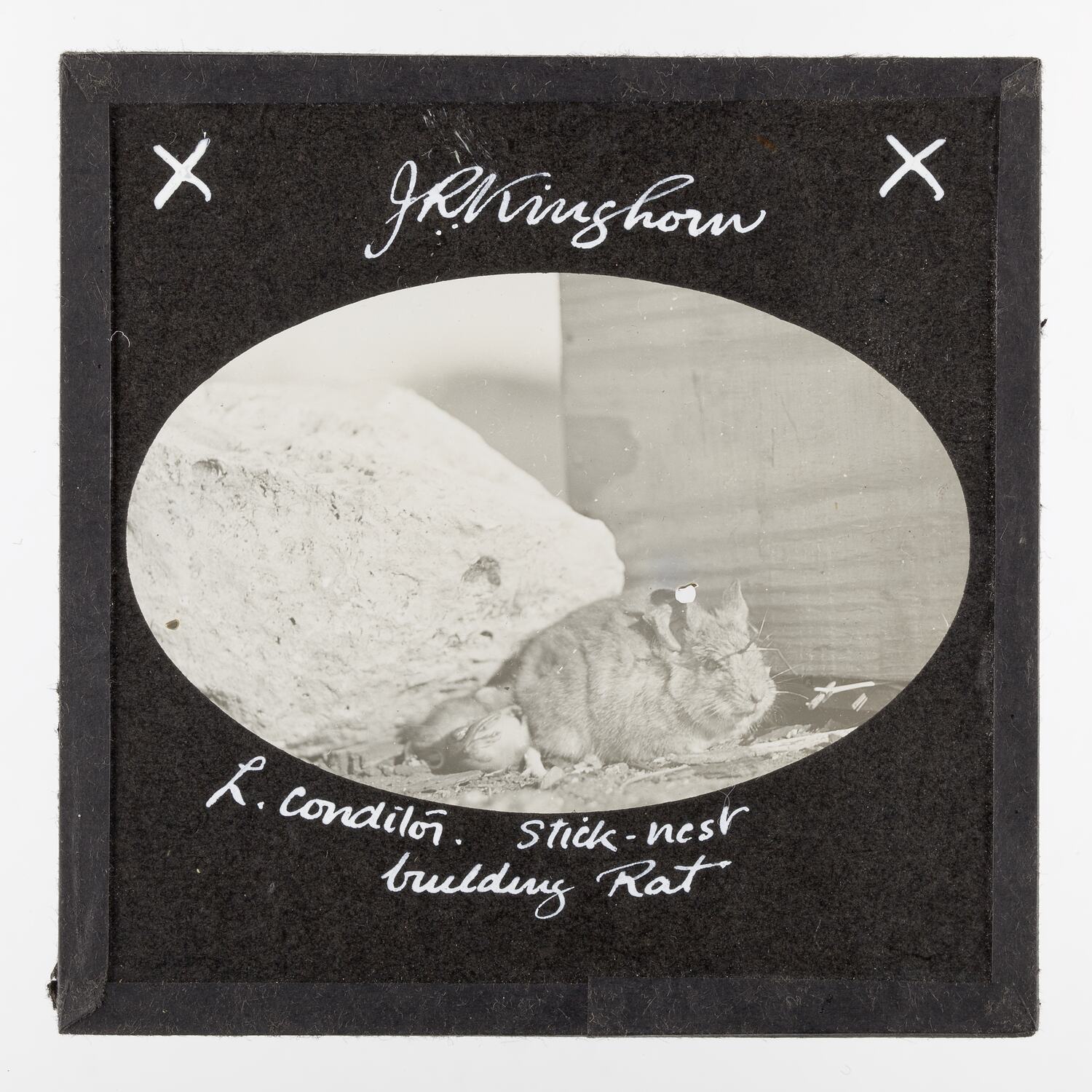 Hand written in white ink on dark grey paper frame above image: J.R.Kinghorn Hand written in white ink on dark grey paper frame below image: L. condiloi. stick-nest / building Rat