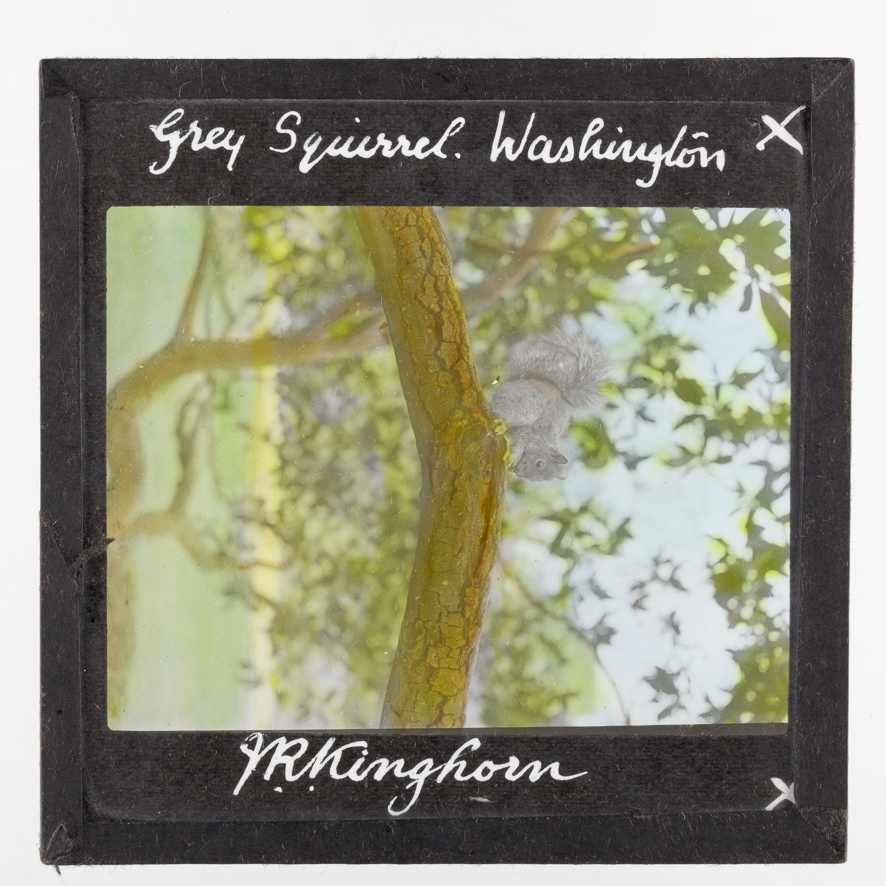 Hand written in white ink on dark grey paper frame above image: Grey Squirrel. Washington Hand written in white ink on dark grey paper frame below image: J.R..Kinghorn