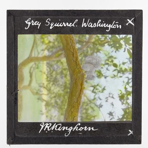 Coloured lantern slide depicting a grey squirrel on a tree branch, taken in Washington D.C.