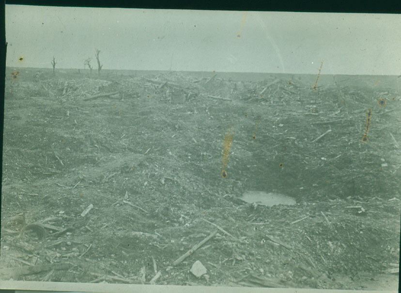Lantern slide depicting a devestated battlefield at Mouquet Farm, near Pozieres, in October 1916. It is identified as a 'scene of severe trench warfare', eventally becoming part of 'no man's land'.