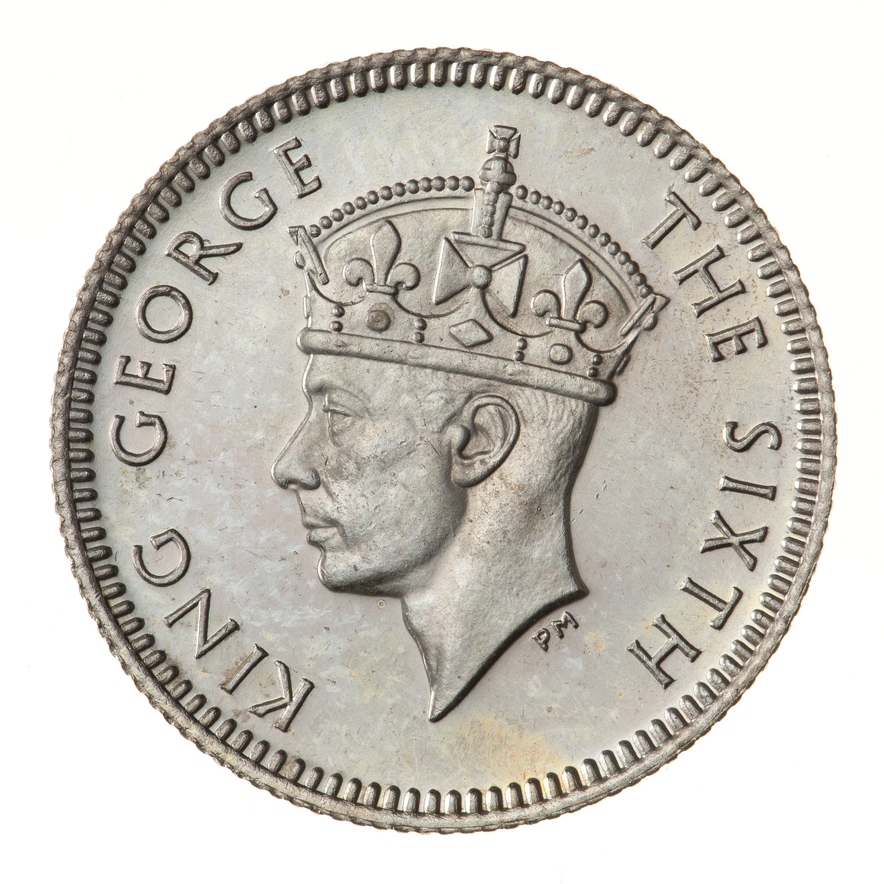 Crowned head of the King facing left; around, KING GEORGE VI THE SIXTH; artist's initials, PM, below neck