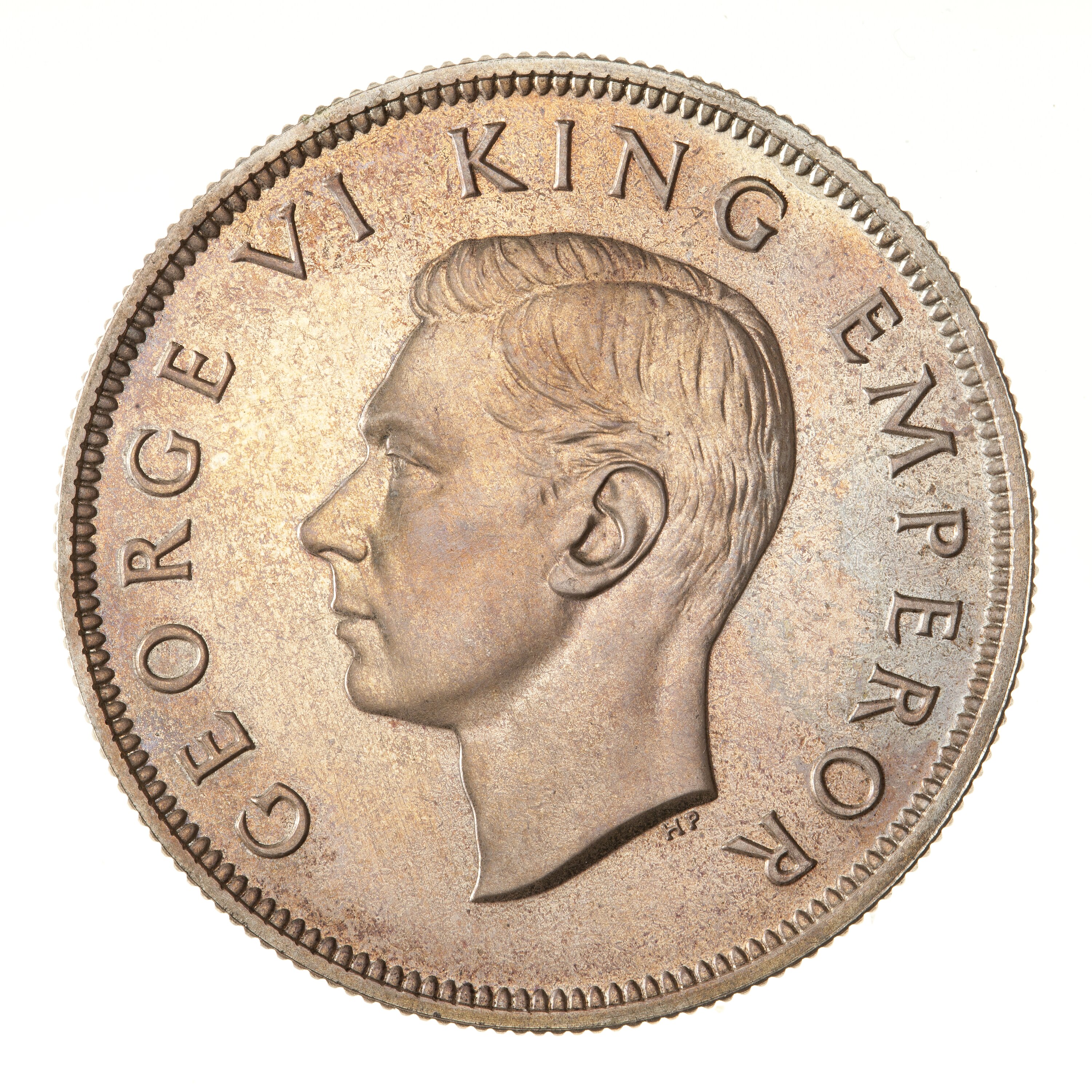King's head, bare, facing left; around, GEORGE VI KING EMPEROR; below neck truncation in small letters the artist's initials HP ([Thomas] Humphrey Paget)