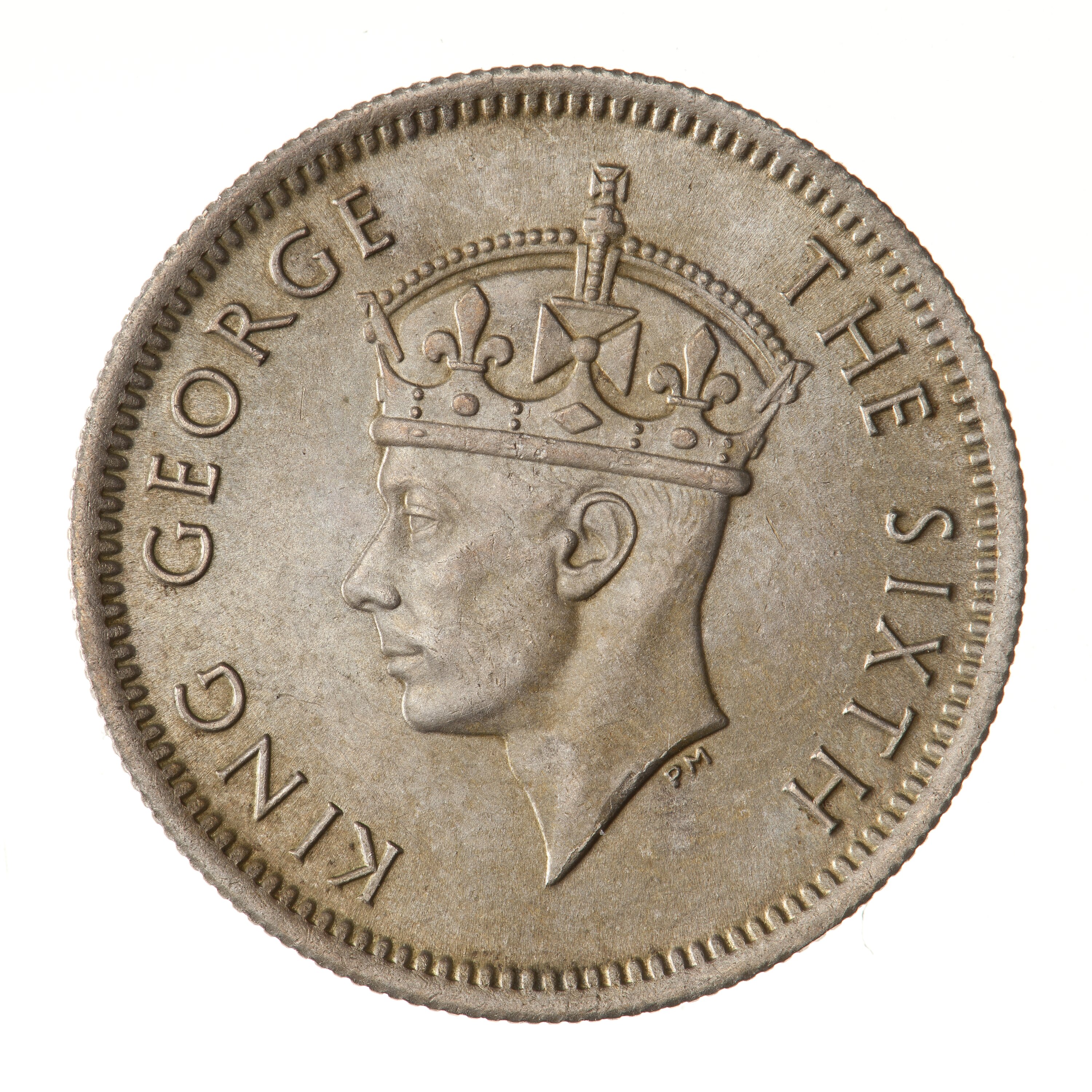 Crowned head of the King facing left; around, KING GEORGE THE SIXTH; artist's initials, PM, below neck