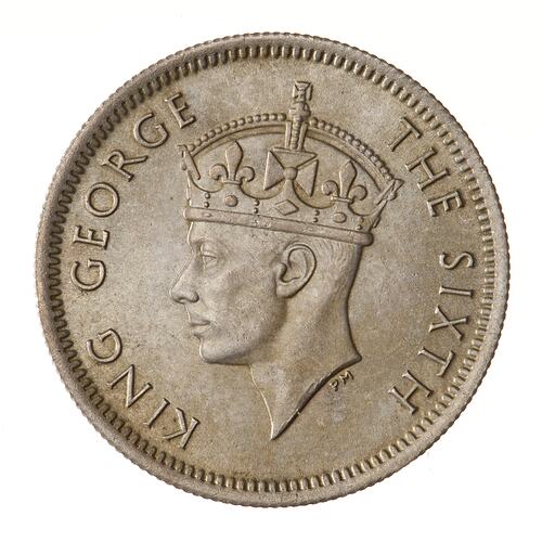 Although this coin bears the date 1950, it could have been struck any time from that year up until 1952. On 1 January 1951 the Board of Commissioners of Currency, Malaya ceased to exist. It was replaced by the new Board of Commissioners of Currency, Malaya and British Borneo on 1 January 1952 but during the interim the old Board name and date 1950 was continued on all coins produced. Then the death of George VI further delayed reference to the new Board with the urgent need for new obverses for Elizabeth II, so again all production during 1952 was of the 1950 design. It was not until the 1953 issue with the new obverse of Elizabeth II till reference to the new Board appears on the reverse of the coins; in that year they began to bear the legend MALAYA AND BRITISH BORNEO.