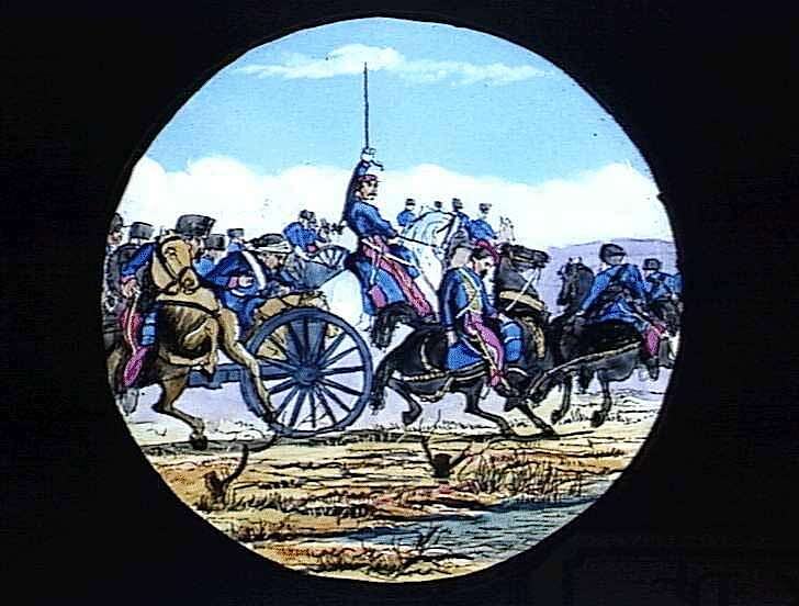 Lantern slide, probably depicting soldiers in the Franco-Prussian War 1870-1871. The war is surmised from associated images that identify this provenance.