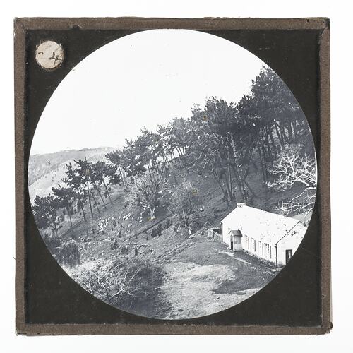 Lantern slide showing the house that Napoleon Bonaparte lived in exile on St Helena, circa 1815.