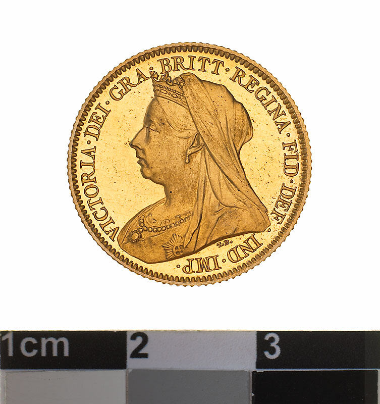 A proof gold coin (19 mm diameter with milled edge) featuring a crowned bust of Queen Victoria facing left, veiled and draped, wearing ribbon and Star of Garter; around VICTORIA . DEI . GRA . BRITT. REGINA . FID . DEF . IND . IMP . , the artist's initials, T.B. are below the bust. The reverse features St. George on horseback holding short sword in right hand, wearing a flowing cape, helmet and boots; the horse rearing to right over a fallen dragon which has a broken lance in its chest; the date, 1901 in the exergue. The mint mark P is in the ground above the middle of the date.