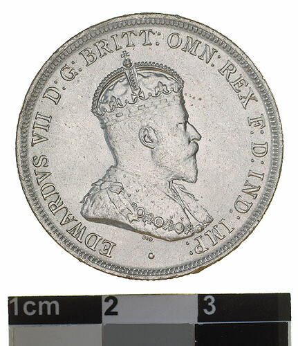 A silver coin (28 mm diameter with milled edge) featuring a crowned and robed bust of Edward VII facing right; around, EDWARDVS VII D:G: BRITT: OMN: REX F: D: IND: IMP: ; below bust in small lettering the artist's initials DES. The reverse features the Ensigns Armorial of the Commonwealth of Australia, as authorised by Royal Warrent 7th May 1908 - composed of a simple shield enclosing a cross of Saint George on which are five six-pointed stars, around the outside of which are six small escutcheons, i.e., small shields. The shield is supported by a kangaroo and an emu standing on a grassy mound. Above the shield a crest, the seven-pointed star of Federation on a wreath. Below on a ribbon the motto ADVANCE AUSTRALIA is inscribed. Around above, ONE FLORIN - TWO SHILLINGS and below, between arrow heads, the date, 1910.