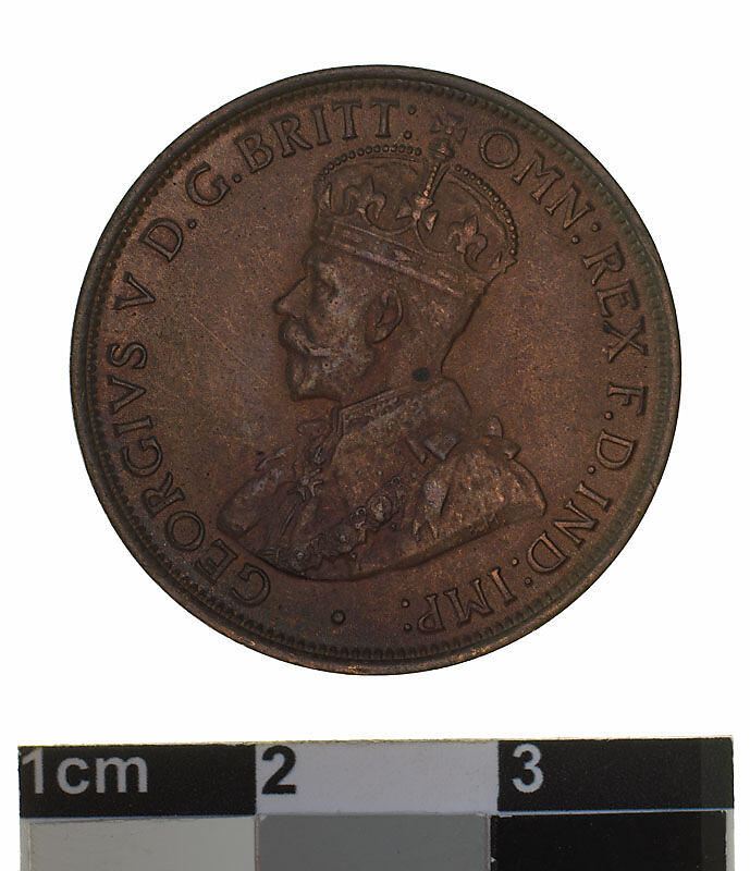 Obverse: GEORGIVS V D. G. BRITT: OMN: REX F. D. IND: IMP: Reverse: ONE HALF PENNY COMMONWEALTH OF AUSTRALIA 1912 H