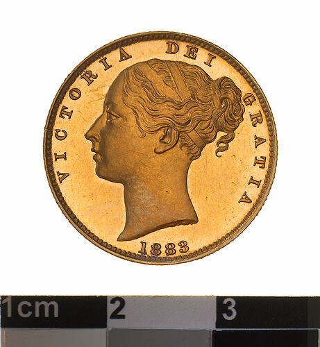 A proof gold coin (21.5 mm diameter with milled edge) featuring a head of Queen Victoria facing left with a plain band and fillet in her hair, the date, 1883; the artist's initials, W.W., in raised letters on neck truncation; around, VICTORIA DEI GRATIA. The reverse features the royal shield of arms, garnished and crowned with the mint mark S below the crossing point of the wreath and above the rose; around, BRITANNIARUM REGINA FID: DEF: