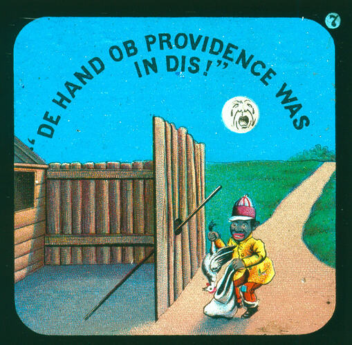Text, on slide: "DE HAND OB PROVIDENCE WAS/ IN DIS!" Printed upper right hand corner: 7