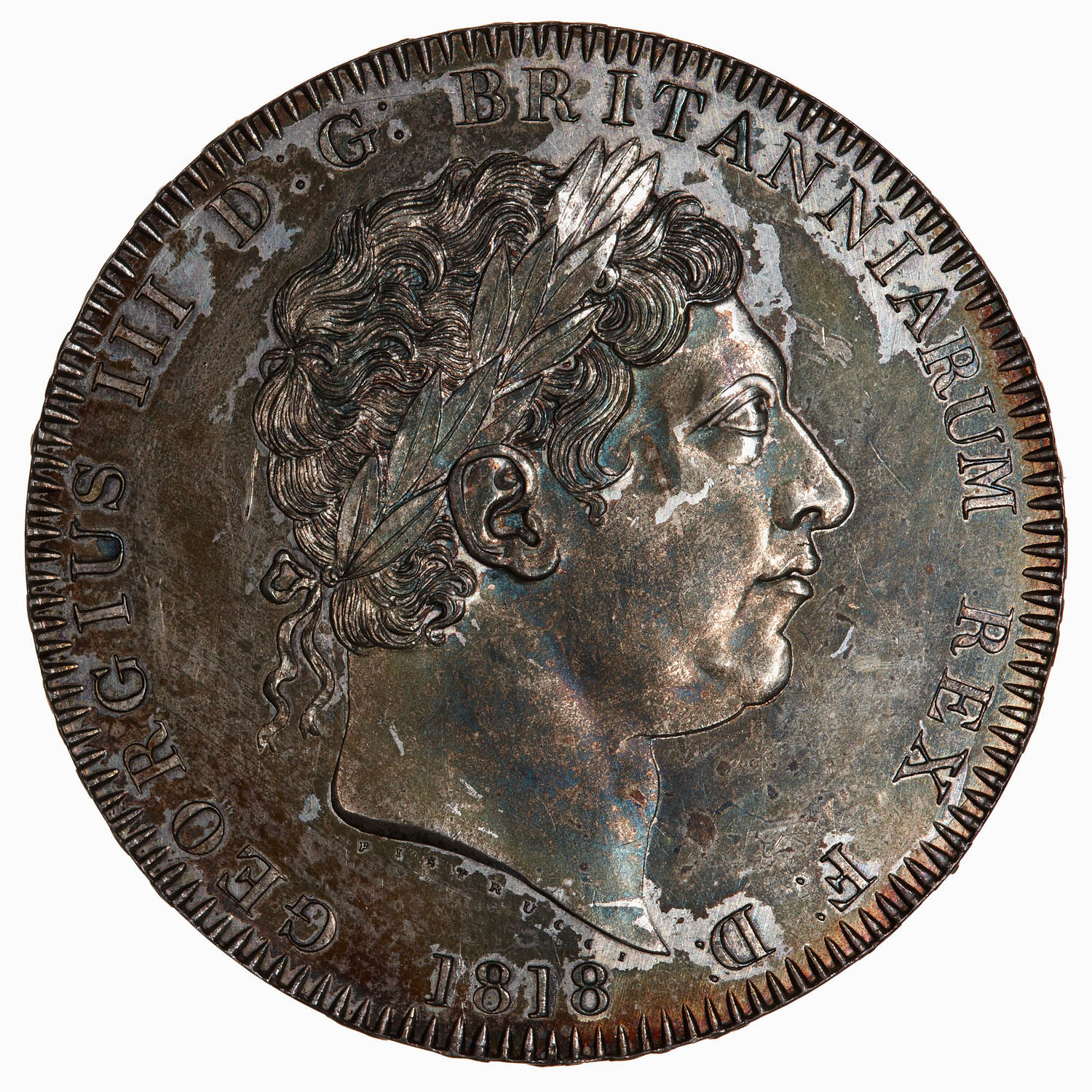 Laureate head of the King facing right; below in small letters, the artist's name, PISTRUCCI; around GEORGIVS III D G BRITANNIARUM REX F D 1818