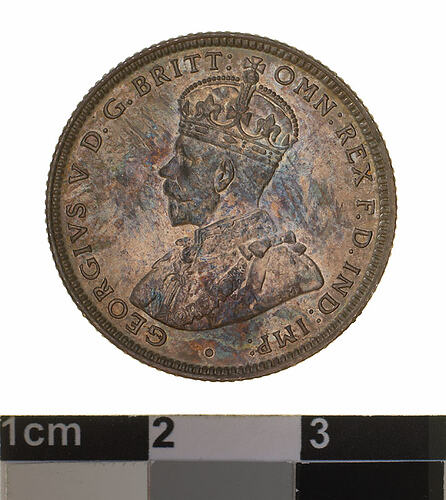 A silver coin (23.5 mm diameter with milled edge) featuring a crowned and robed bust of George V facing left; around, GEORGIVS V D. G. BRITT: OMN: REX F. D. IND: IMP: ; below bust in small lettering the artist's initials B.M. The reverse features the Ensigns Armorial of the Commonwealth of Australia, as authorised by Royal Warrent 7th May 1908 - composed of a simple shield enclosing a cross of Saint George on which are five six-pointed stars, around the outside of which are six small escutcheons, i.e., small shields. The shield is supported by a kangaroo and an emu standing on a grassy mound. Above the shield a crest, the seven-pointed star of Federation on a wreath. Below on a ribbon the motto ADVANCE AUSTRALIA is inscribed. Around above, ONE SHILLING and below, between arrow heads, the date, 1917. Below the date is the mint mark M.