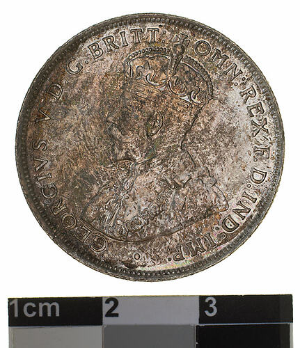 A silver coin (28 mm diameter with milled edge) featuring a crowned and robed bust of George V facing left; around, GEORGIVS V D.G. BRITT: OMN: REX F.D. IND: IMP: ; below bust in small lettering the artist's initials B.M. The reverse features the Ensigns Armorial of the Commonwealth of Australia, as authorised by Royal Warrent 7th May 1908 - composed of a simple shield enclosing a cross of Saint George on which are five six-pointed stars, around the outside of which are six small escutcheons, i.e., small shields. The shield is supported by a kangaroo and an emu standing on a grassy mound. Above the shield a crest, the seven-pointed star of Federation on a wreath. Below on a ribbon the motto ADVANCE AUSTRALIA is inscribed. Around above, ONE FLORIN - TWO SHILLINGS and below, between arrow heads, the date, 1911.