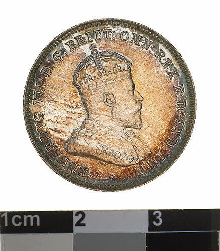 A silver coin (23.5 mm diameter with milled edge) featuring a crowned and robed bust of Edward VII facing right; around, EDWARDVS VII D:G: BRITT: OMN: REX F: D: IND: IMP: ; below bust in small lettering the artist's initials DES. The reverse features the Ensigns Armorial of the Commonwealth of Australia, as authorised by Royal Warrent 7th May 1908 - composed of a simple shield enclosing a cross of Saint George on which are five six-pointed stars, around the outside of which are six small escutcheons, i.e., small shields. The shield is supported by a kangaroo and an emu standing on a grassy mound. Above the shield a crest, the seven-pointed star of Federation on a wreath. Below on a ribbon the motto ADVANCE AUSTRALIA is inscribed. Around above, ONE SHILLING and below, between arrow heads, the date, 1910.