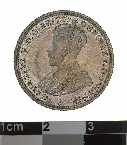 A matt proof silver coin (23.5 mm diameter with milled edge) featuring a crowned and robed bust of George V facing left; around, GEORGIVS V D.G. BRITT: OMN: REX F.D. IND: IMP: ; below bust in small lettering the artist's initials B.M. The reverse features the Ensigns Armorial of the Commonwealth of Australia, as authorised by Royal Warrent 7th May 1908 - composed of a simple shield enclosing a cross of Saint George on which are five six-pointed stars, around the outside of which are six small escutcheons, i.e., small shields. The shield is supported by a kangaroo and an emu standing on a grassy mound. Above the shield a crest, the seven-pointed star of Federation on a wreath. Below on a ribbon the motto ADVANCE AUSTRALIA is inscribed. Around above, ONE SHILLING and below, between arrow heads, the date, 1911.